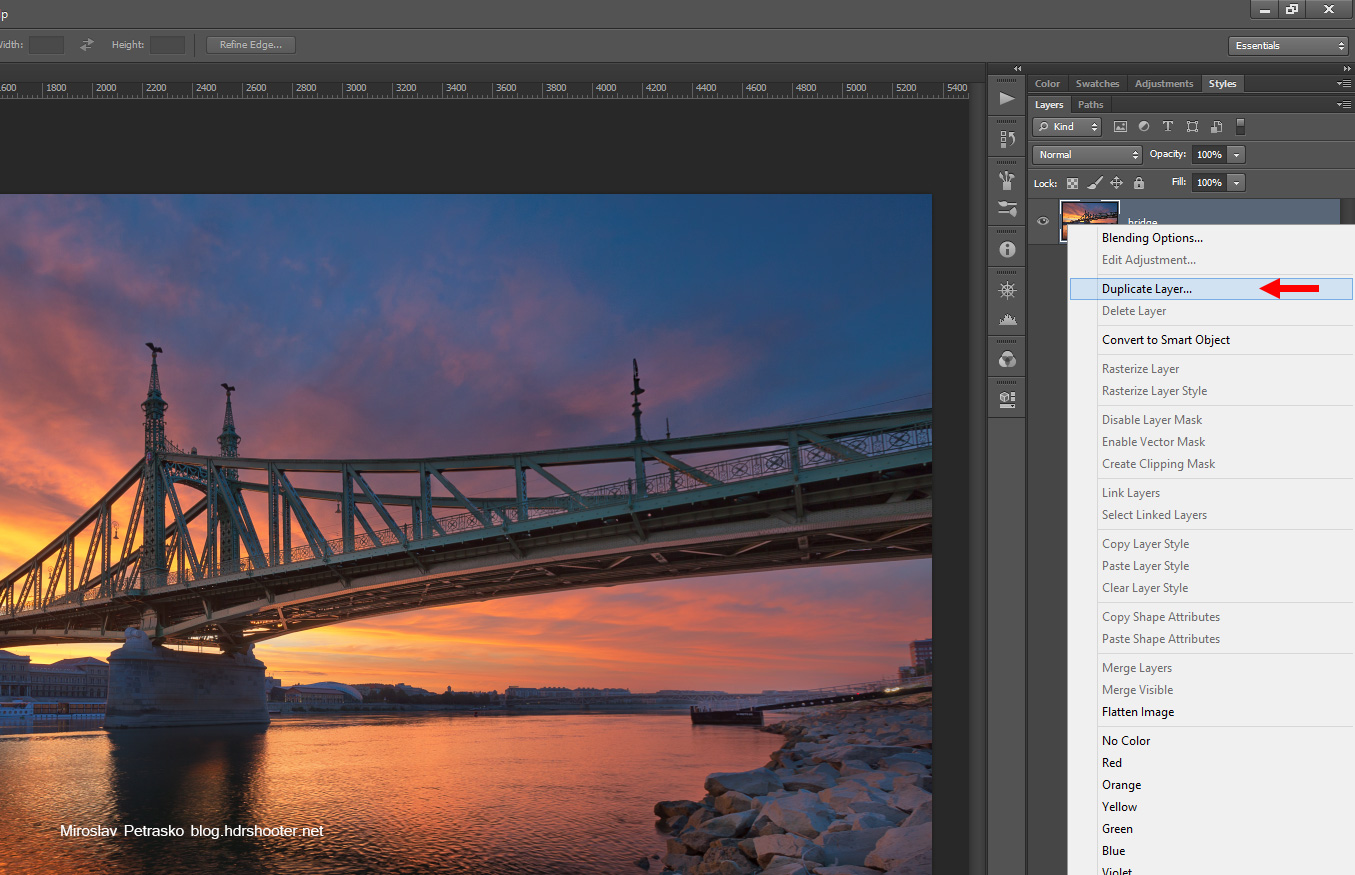 Our fist step is to duplicate this photo (if you have a file with multiple layers, just merge them into one new layer). To duplicate, right click on the layer and select duplicate layer