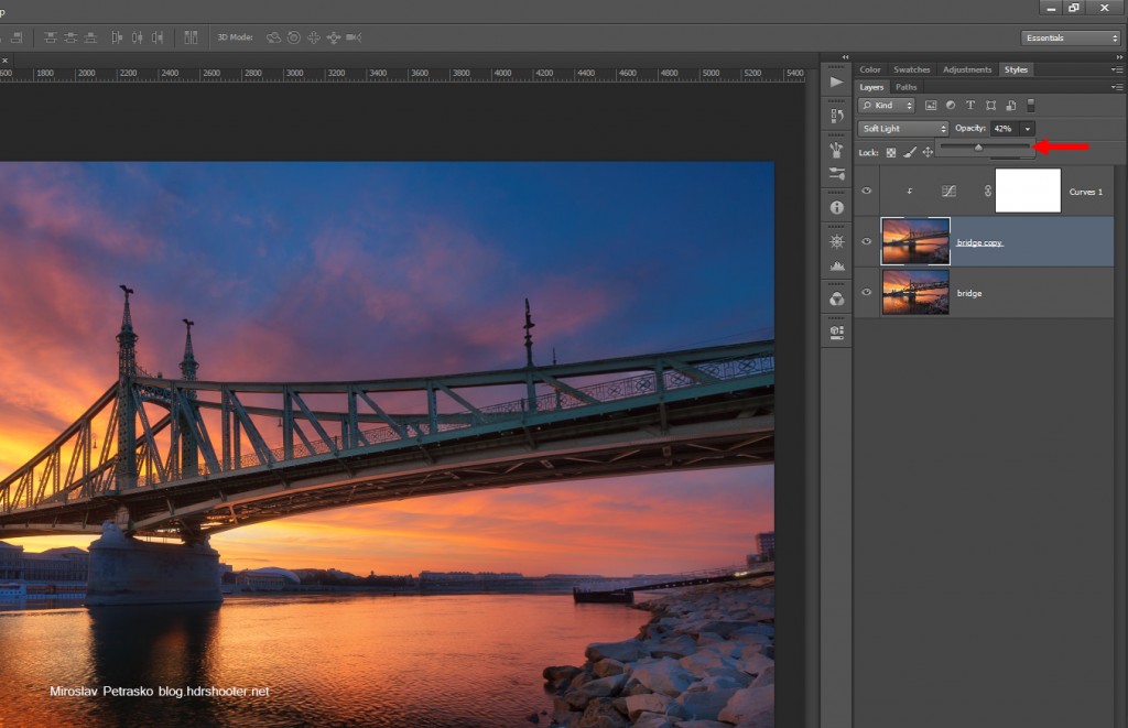 You can see the photo now completely changed, but it a little bit to dark, so we need to brighten the effect. I use for that a new adjustment layer. You can use anyone, but I prefer Curves, as I can add more contrast if needed. So choose new adjustment layer and curves