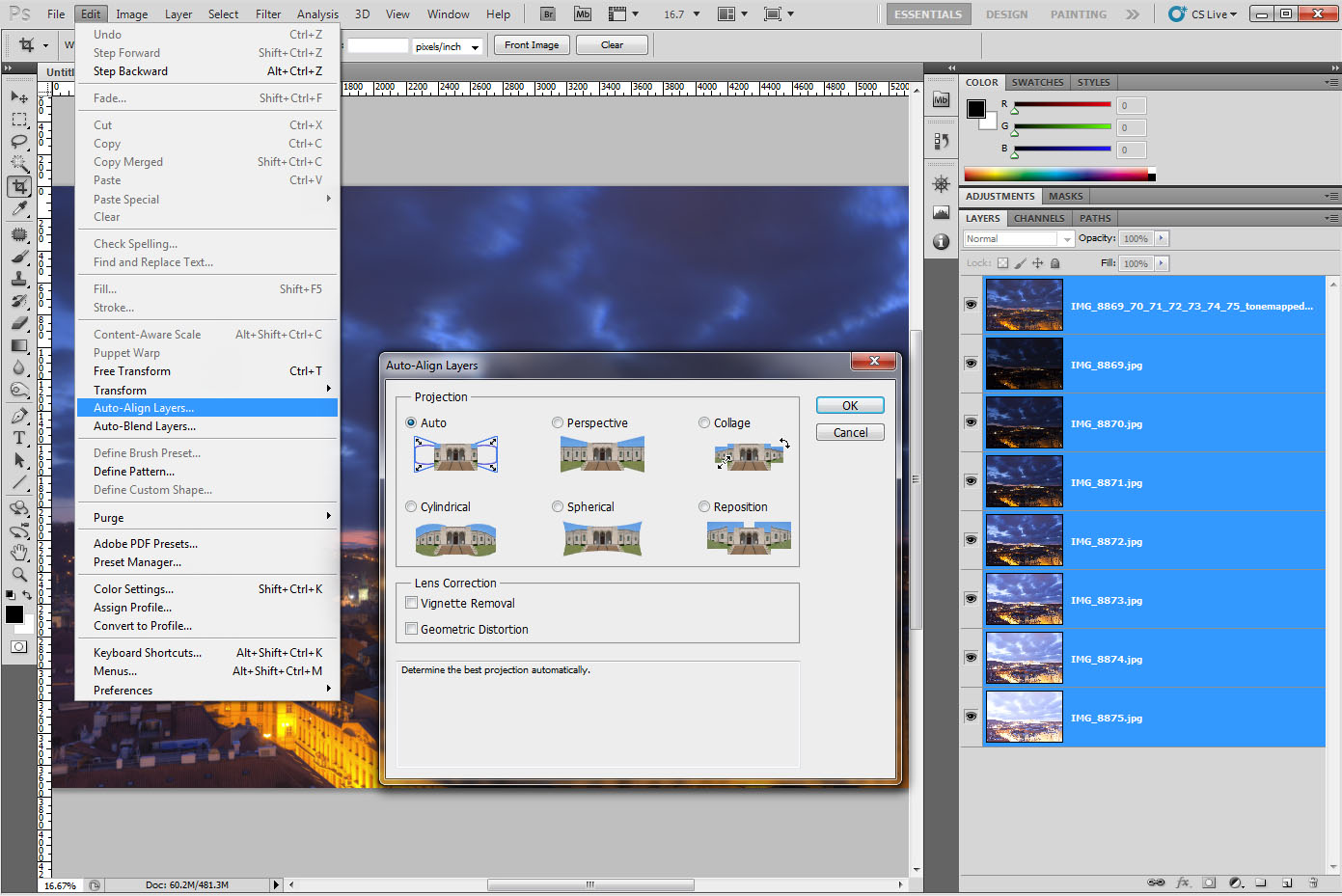 - choosing edit->Auto Align Layers -> select Auto -> OK