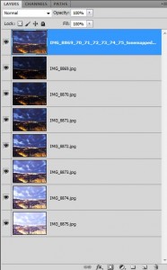 Here you can see how I removed the whole sky from one of the original shots, as the clouds were moving to much. I prefer to group layers, as I go back and forth between different layers and sometimes remix them in between each other.