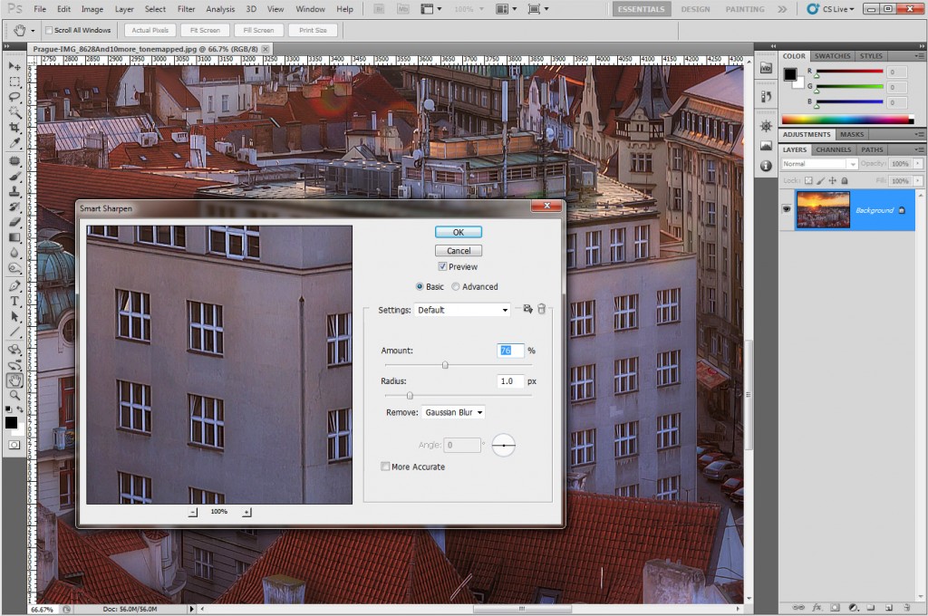 Smart sharpen is another filter in Photoshop. It is popular by some fotographers and it can create similar results to unsharp mask. It can be found under Filters -> Sharpen -> Smart Sharpen. I don’t use it very often but my settings here are around 80% and 1px radius.